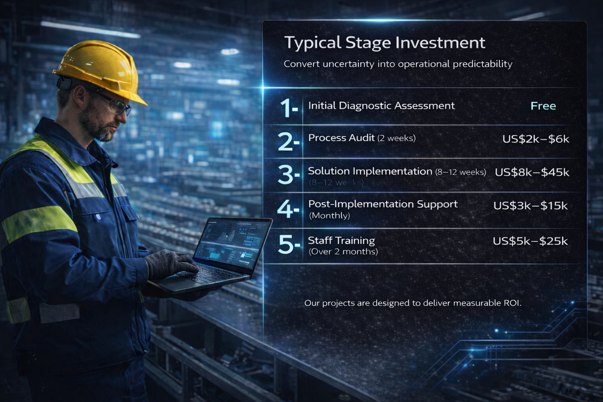 We transform scattered data from ERP/WMS/TMS and the factory floor into actionable visibility and performance control (cost, time, quality, and service) through an operational data strategy with dashboards, alerts, and lightweight predictive analytics; this typically recovers 10–15% of operating profitability and reduces inventory or rework by 15–30% by anticipating deviations before they become costly.